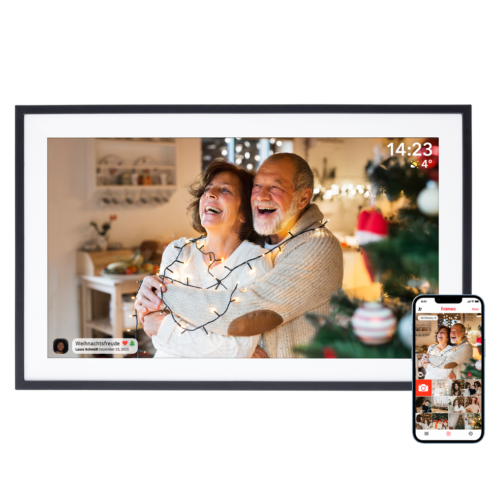 The Smart Frame WiFi 151 offers many different functions, such as one Automatic or manual rotation function the recordings, one Adaptation or filling function the recordings on the framework, a Lettering function the recordings and a reaction function with different emojis. With various colorful graphics frames you can also beautify your photos and videos. You also have the option of displaying the current time, the current temperature and the weather in the top right corner of the display. And with the Sleep mode function You can, for example, determine that the screen of the picture frame automatically switches off in the evening and switches on again in the morning to To minimize power consumption.